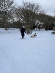 Einige Kinder sind gerodelt beim Strandaufgang vor dem Campingplatz. Unser Sohn ist dazu noch zu klein mit einem Jahr, aber wir haben ihn auf dem Schlitten über die Wiese gezogen. Fand er super!
